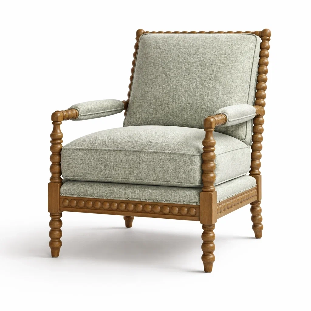 Poltrona in tessuto verde con struttura robusta