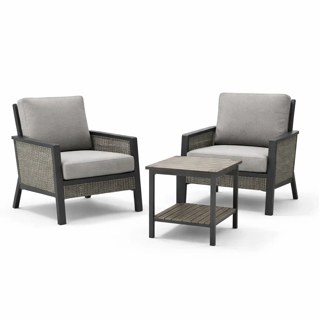 Set da relax piccolo da giardino a tre pezzi in alluminio e rattan con cuscini grigi